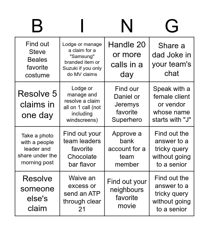 This bingo card has 16 words: Waive an excess or send an ATP through clear 21, Find out the answer to a tricky query without going to a senior, Handle 20 or more calls in a day, Find out Steve Beales favorite costume, Take a photo with a people leader and share under the morning post, Lodge or manage a claim for a "Samsung" branded item or Suzuki if you only do MV claims, Approve a bank account for a team member, Find out your neighbours favorite movie, Resolve 5 claims in one day, Lodge or manage and resolve a claim all on 1 call (not including windscreens), Resolve someone else's claim, Share a dad Joke in your team's chat, Find out your team leaders favorite Chocolate bar flavor, Speak with a female client or vendor whose name starts with "J", Find our Daniel or Jeremys favorite Superhero and Find out the answer to a tricky query without going to a senior.