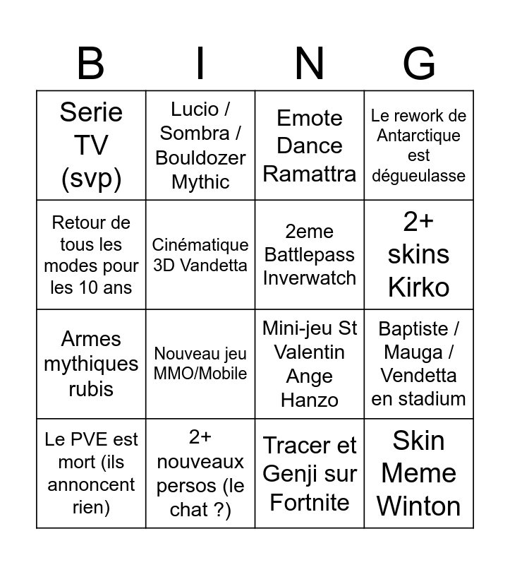 This bingo card has 16 words: 2+ nouveaux persos (le chat ?), Baptiste / Mauga / Vendetta en stadium, Emote Dance Ramattra, Serie TV (svp), Armes mythiques rubis, Lucio / Sombra / Bouldozer Mythic, Mini-jeu St Valentin Ange Hanzo, Tracer et Genji sur Fortnite, Retour de tous les modes pour les 10 ans, Cinématique 3D Vandetta, Le PVE est mort (ils annoncent rien), Le rework de Antarctique est dégueulasse, Nouveau jeu MMO/Mobile, 2+ skins Kirko, 2eme Battlepass Inverwatch and Skin Meme Winton.