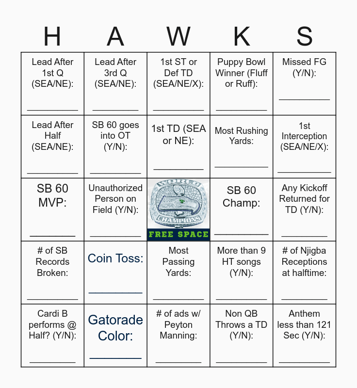 This bingo card has a free space and 24 words: Coin Toss: ________, Gatorade Color: _______, 1st TD (SEA or NE): _________, Cardi B performs @ Half? (Y/N): _________, Missed FG (Y/N): __________, Lead After 1st Q (SEA/NE): __________, Lead After Half (SEA/NE): __________, Lead After 3rd Q (SEA/NE): _________, SB 60 Champ: _________, Most Passing Yards: __________, Most Rushing Yards: ___________, SB 60 MVP: _______, More than 9 HT songs (Y/N): __________, # of Njigba Receptions at halftime: _________, SB 60 goes into OT (Y/N): __________, Non QB Throws a TD (Y/N): __________, Any Kickoff Returned for TD (Y/N): _________, 1st ST or Def TD (SEA/NE/X): __________, 1st Interception (SEA/NE/X): ___________, Unauthorized Person on Field (Y/N): __________, Anthem less than 121 Sec (Y/N): __________, # of SB Records Broken: __________, Puppy Bowl Winner (Fluff or Ruff): __________ and # of ads w/ Peyton Manning: _________.