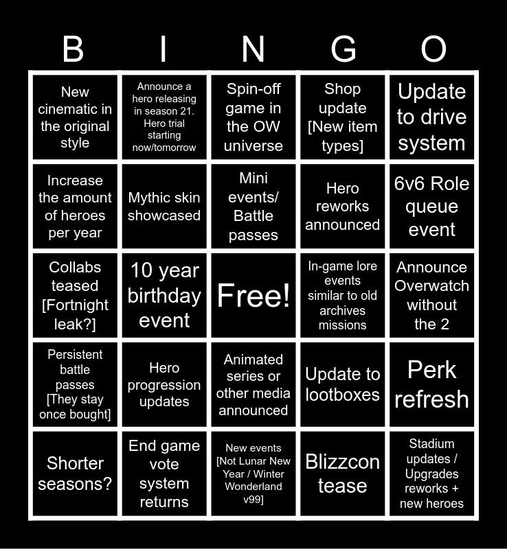 This bingo card has a free space and 24 words: Hero progression updates, End game vote system returns, Mini events/ Battle passes, Shorter seasons?, Update to drive system, New cinematic in the original style, Increase the amount of heroes per year, Announce a hero releasing in season 21. Hero trial starting now/tomorrow, In-game lore events similar to old archives missions, Animated series or other media announced, Hero reworks announced, Collabs teased [Fortnight leak?], Update to lootboxes, Perk refresh, Mythic skin showcased, Blizzcon tease, Announce Overwatch without the 2, Spin-off game in the OW universe, 6v6 Role queue event, 10 year birthday event, Stadium updates / Upgrades reworks + new heroes, Persistent battle passes [They stay once bought], Shop update [New item types] and New events [Not Lunar New Year / Winter Wonderland v99].