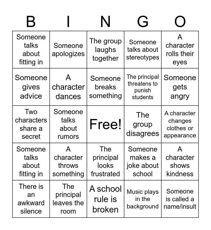 This bingo card has a free space and 24 words: A character throws something, The principal leaves the room, Someone breaks something, There is an awkward silence, A character rolls their eyes, Someone talks about fitting in, Someone gives advice, Someone apologizes, The group disagrees, The principal looks frustrated, The principal threatens to punish students, Two characters share a secret, Someone makes a joke about school, A character shows kindness, A character dances, Music plays in the background, A character changes clothes or appearance, The group laughs together, Someone gets angry, Someone talks about rumors, Someone is called a name/insult, Someone talks about fitting in, Someone talks about stereotypes and A school rule is broken.