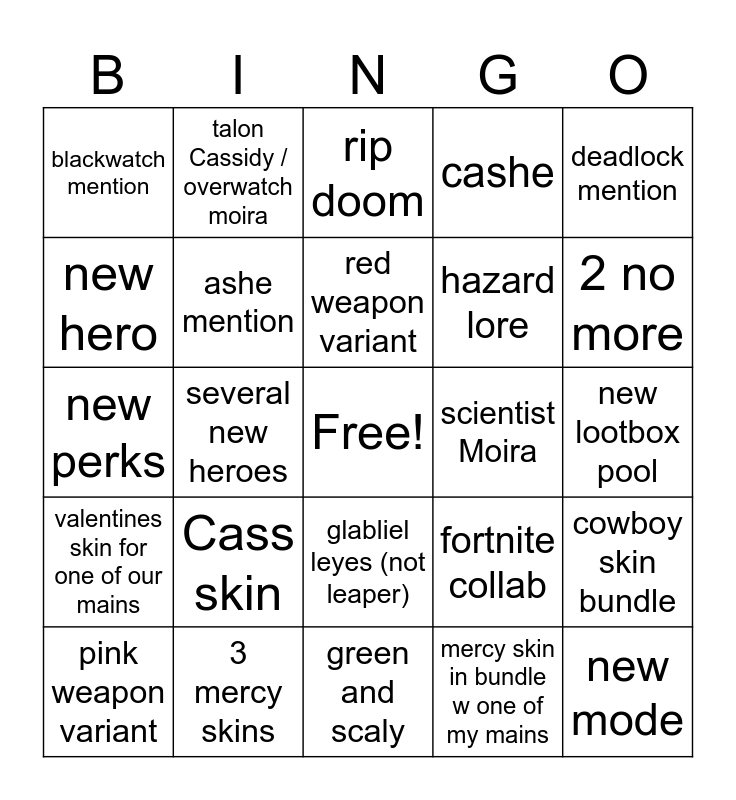 This bingo card has a free space and 24 words: Cass skin, 3 mercy skins, red weapon variant, pink weapon variant, deadlock mention, blackwatch mention, new hero, talon Cassidy / overwatch moira, scientist Moira, glabliel leyes (not leaper), hazard lore, new perks, fortnite collab, cowboy skin bundle, ashe mention, mercy skin in bundle w one of my mains, new lootbox pool, rip doom, 2 no more, several new heroes, new mode, valentines skin for one of our mains, cashe and green and scaly.