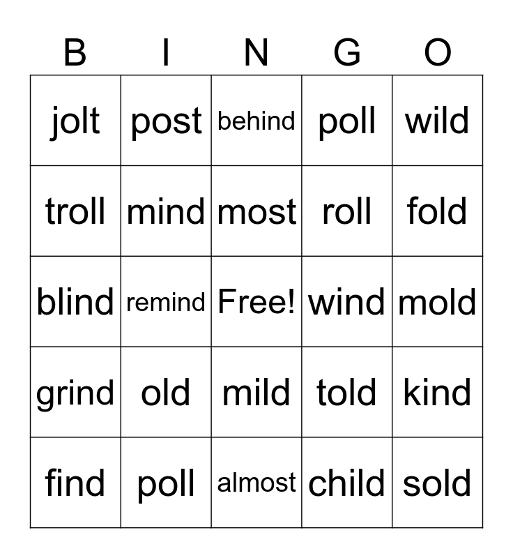 This bingo card has a free space and 24 words: old, poll, most, find, wild, jolt, troll, post, wind, mild, roll, blind, told, kind, mind, child, mold, behind, fold, remind, sold, grind, poll and almost.