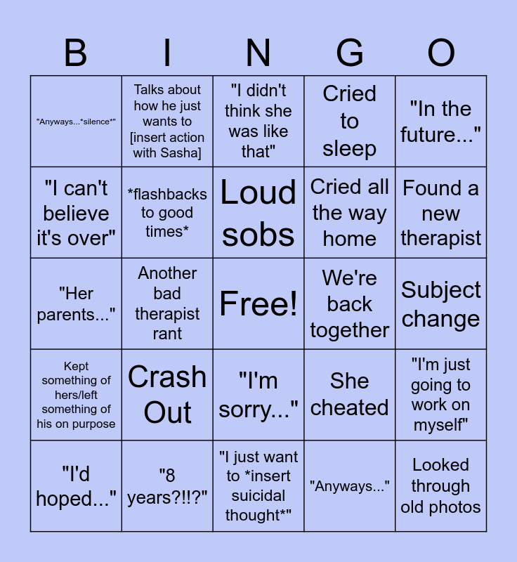 This bingo card has a free space and 24 words: Crash Out, "8 years?!!?", Loud sobs, "I'd hoped...", "In the future...", "Anyways...*silence*", "I can't believe it's over", Talks about how he just wants to [insert action with Sasha], We're back together, "I'm sorry...", Cried all the way home, "Her parents...", She cheated, "I'm just going to work on myself", *flashbacks to good times*, "Anyways...", Subject change, "I didn't think she was like that", Found a new therapist, Another bad therapist rant, Looked through old photos, Kept something of hers/left something of his on purpose, Cried to sleep and "I just want to *insert suicidal thought*".