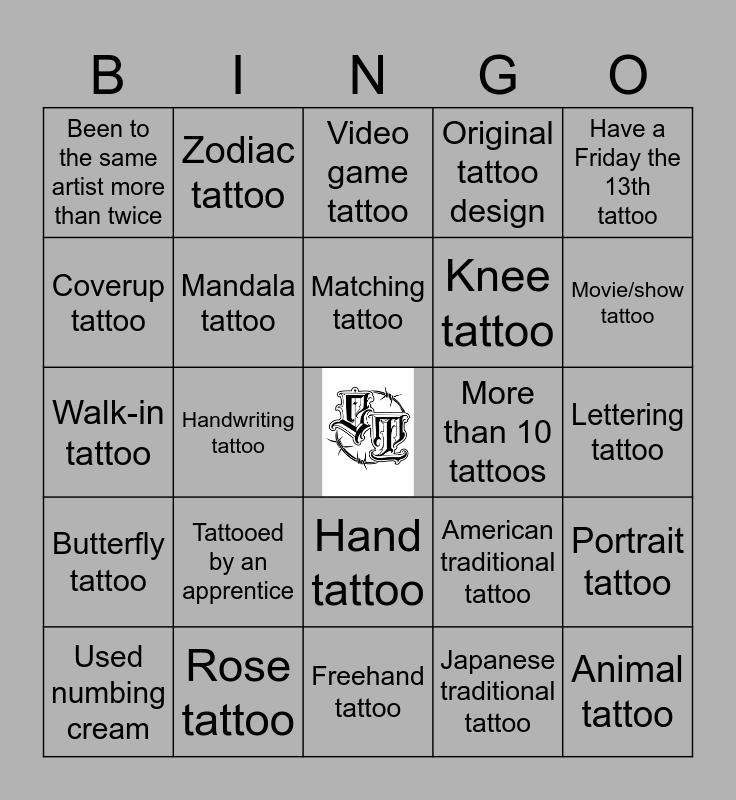 This bingo card has a free space and 24 words: Tattooed by an apprentice, Rose tattoo, Matching tattoo, Used numbing cream, Have a Friday the 13th tattoo, Been to the same artist more than twice, Coverup tattoo, Zodiac tattoo, More than 10 tattoos, Hand tattoo, Knee tattoo, Walk-in tattoo, American traditional tattoo, Portrait tattoo, Mandala tattoo, Japanese traditional tattoo, Lettering tattoo, Video game tattoo, Movie/show tattoo, Handwriting tattoo, Animal tattoo, Butterfly tattoo, Original tattoo design and Freehand tattoo.