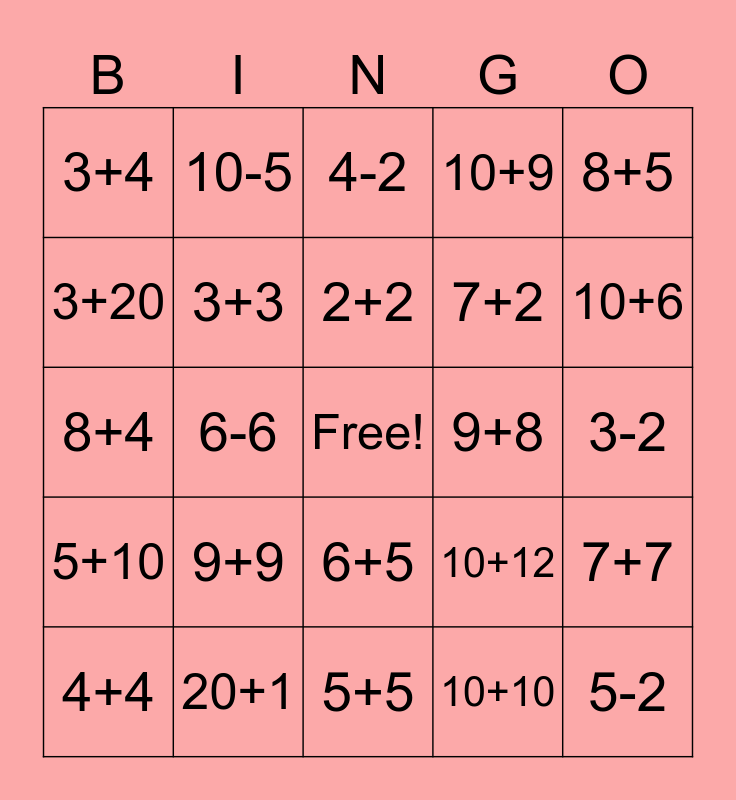 This bingo card has a free space and 24 words: 9+9, 20+1, 2+2, 4+4, 8+5, 3+4, 3+20, 10-5, 9+8, 6+5, 7+2, 8+4, 10+12, 7+7, 3+3, 10+10, 3-2, 4-2, 10+6, 6-6, 5-2, 5+10, 10+9 and 5+5.