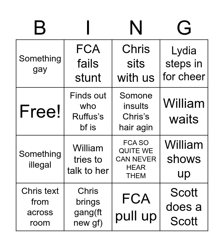 This bingo card has 16 words: Chris brings gang(ft new gf), William shows up, Chris sits with us, Something gay, Something illegal, FCA fails stunt, FCA SO QUITE WE CAN NEVER HEAR THEM, FCA pull up, Free!, Finds out who Ruffus’s bf is, Chris text from across room, Lydia steps in for cheer, William tries to talk to her, William waits, Somone insults Chris’s hair agin and Scott does a Scott.
