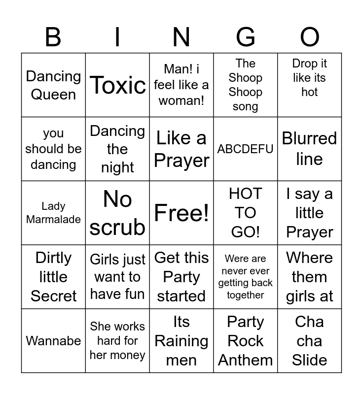 This bingo card has a free space and 29 words: Wannabe, Nonsense, No scrub, Valerie, Dancing Queen, Man! i feel like a woman!, Dancing the night, Girls just want to have fun, HOT TO GO!, She works hard for her money, I say a little Prayer, Cha cha Slide, Its Raining men, Party Rock Anthem, Blurred line, Bye Bye Bye, Get this Party started, Dirtly little Secret, Drop it like its hot, Lady Marmalade, Were are never ever getting back together, waterfalls, ABCDEFU, you should be dancing, The Shoop Shoop song, Toxic, Where them girls at, Like a Prayer and I wanna dance with Somebody.