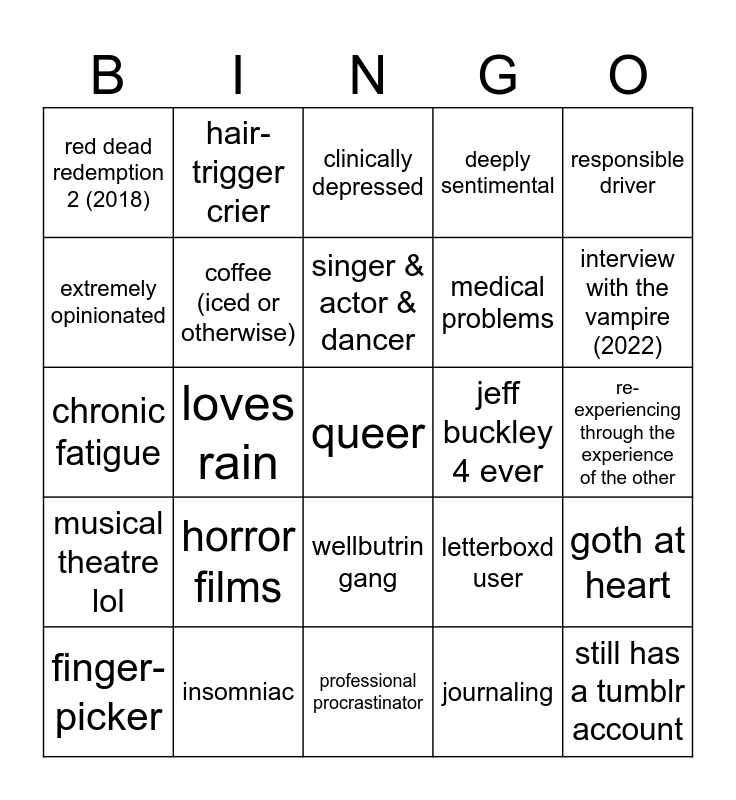 This bingo card has a free space and 24 words: horror films, insomniac, singer & actor & dancer, finger-picker, responsible driver, red dead redemption 2 (2018), extremely opinionated, hair-trigger crier, jeff buckley 4 ever, wellbutrin gang, medical problems, chronic fatigue, letterboxd user, goth at heart, coffee (iced or otherwise), journaling, re-experiencing through the experience of the other, clinically depressed, interview with the vampire (2022), loves rain, still has a tumblr account, musical theatre lol, deeply sentimental and professional procrastinator.