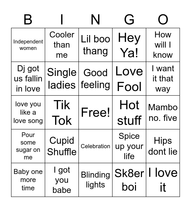 This bingo card has a free space and 29 words: Baby one more time, Paper Rings, Tik Tok, Jumpin jumpin, Independent women, Lil boo thang, Single ladies, Cupid Shuffle, Hot stuff, I got you babe, Mambo no. five, I love it, Blinding lights, Sk8er boi, I want it that way, Hot in here, Celebration, Pour some sugar on me, How will I know, love you like a love song, Spice up your life, Pink pony Club, Love Fool, Dj got us fallin in love, Hey Ya!, Cooler than me, Hips dont lie, Good feeling and WE found love.