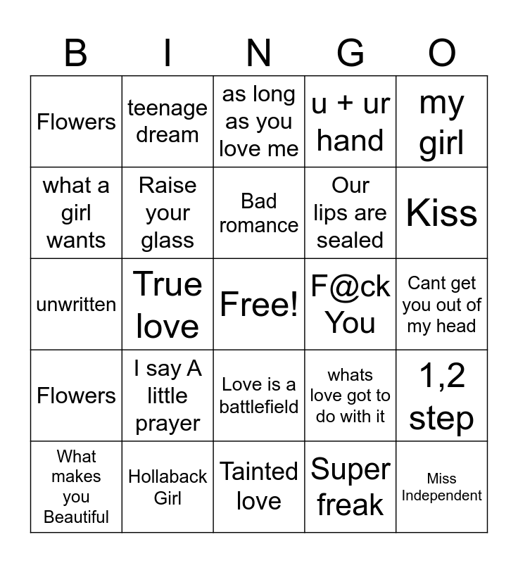 This bingo card has a free space and 29 words: What makes you Beautiful, Love Story, True love, Just a girl, Flowers, as long as you love me, Raise your glass, I say A little prayer, F@ck You, Hollaback Girl, Cant get you out of my head, Miss Independent, Tainted love, Super freak, Kiss, when i grow up, Love is a battlefield, Flowers, my girl, unwritten, whats love got to do with it, isnt she lovely, Our lips are sealed, what a girl wants, u + ur hand, teenage dream, 1,2 step, Bad romance and this love.