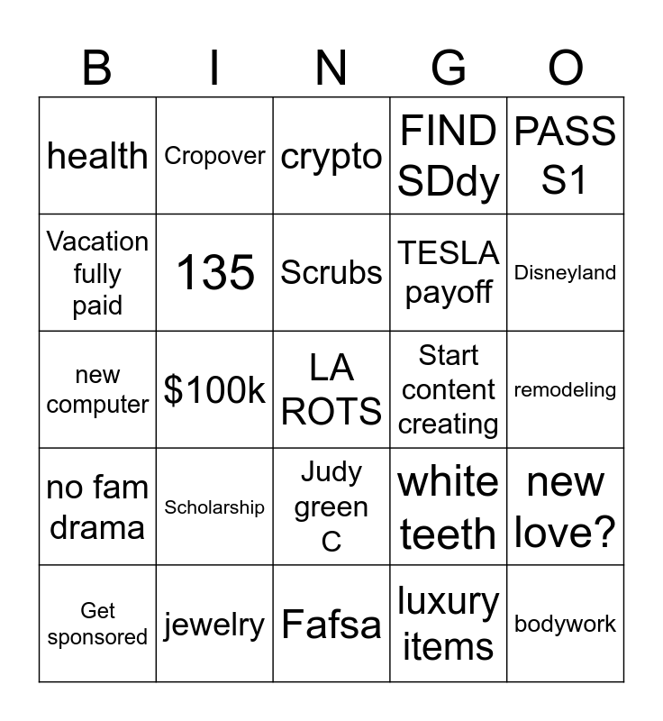 This bingo card has a free space and 24 words: Get sponsored, Scholarship, Scrubs, luxury items, PASS S1, health, Cropover, crypto, Start content creating, remodeling, new computer, 135, white teeth, new love?, Vacation fully paid, jewelry, Fafsa, FIND SDdy, Disneyland, no fam drama, $100k, Judy green C, TESLA payoff and bodywork.