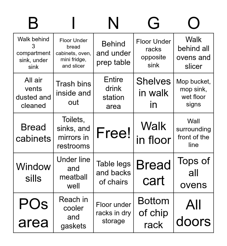 This bingo card has a free space and 24 words: Under line and meatball well, Reach in cooler and gaskets, Entire drink station area, POs area, Walk behind all ovens and slicer, Walk behind 3 compartment sink, under sink, All air vents dusted and cleaned, Floor Under bread cabinets, oven, mini fridge, and slicer, Walk in floor, Table legs and backs of chairs, Shelves in walk in, Bread cabinets, Bread cart, Tops of all ovens, Trash bins inside and out, Bottom of chip rack, Wall surrounding front of the line, Behind and under prep table, Mop bucket, mop sink, wet floor signs, Toilets, sinks, and mirrors in restrooms, All doors, Window sills, Floor Under racks opposite sink and Floor under racks in dry storage.