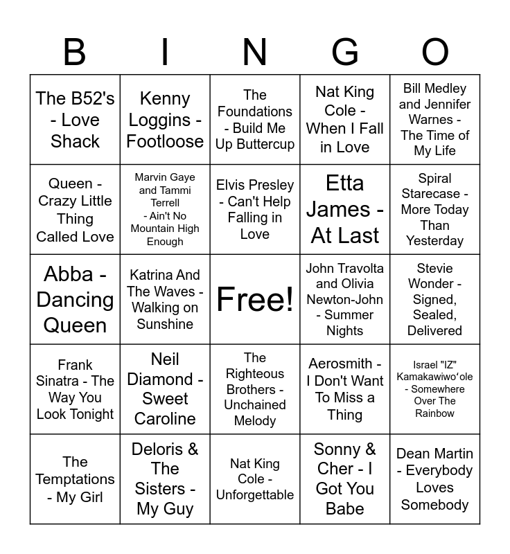This bingo card has a free space and 24 words: Neil Diamond - Sweet Caroline, Deloris & The Sisters - My Guy, Elvis Presley - Can't Help Falling in Love, The Temptations - My Girl, Bill Medley and Jennifer Warnes - The Time of My Life, The B52's - Love Shack, Queen - Crazy Little Thing Called Love, Kenny Loggins - Footloose, John Travolta and Olivia Newton-John - Summer Nights, The Righteous Brothers - Unchained Melody, Etta James - At Last, Abba - Dancing Queen, Aerosmith - I Don't Want To Miss a Thing, Israel "IZ" Kamakawiwoʻole - Somewhere Over The Rainbow, Marvin Gaye and Tammi Terrell - Ain't No Mountain High Enough, Sonny & Cher - I Got You Babe, Stevie Wonder - Signed, Sealed, Delivered, The Foundations - Build Me Up Buttercup, Spiral Starecase - More Today Than Yesterday, Katrina And The Waves - Walking on Sunshine, Dean Martin - Everybody Loves Somebody, Frank Sinatra - The Way You Look Tonight, Nat King Cole - When I Fall in Love and Nat King Cole - Unforgettable.