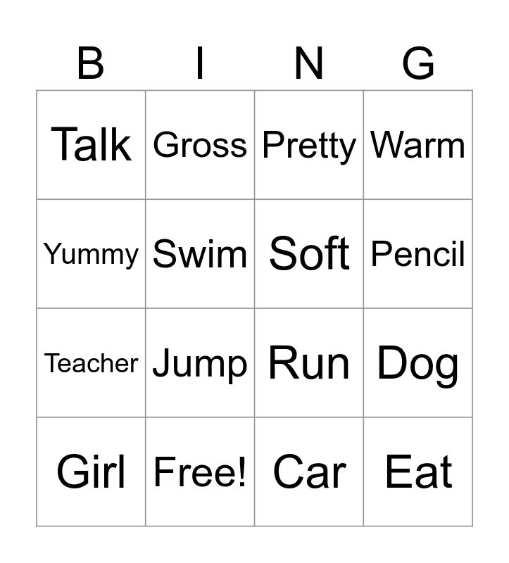 This bingo card has 16 words: Free!, Dog, Pretty, Talk, Teacher, Gross, Run, Car, Yummy, Swim, Girl, Warm, Jump, Pencil, Soft and Eat.