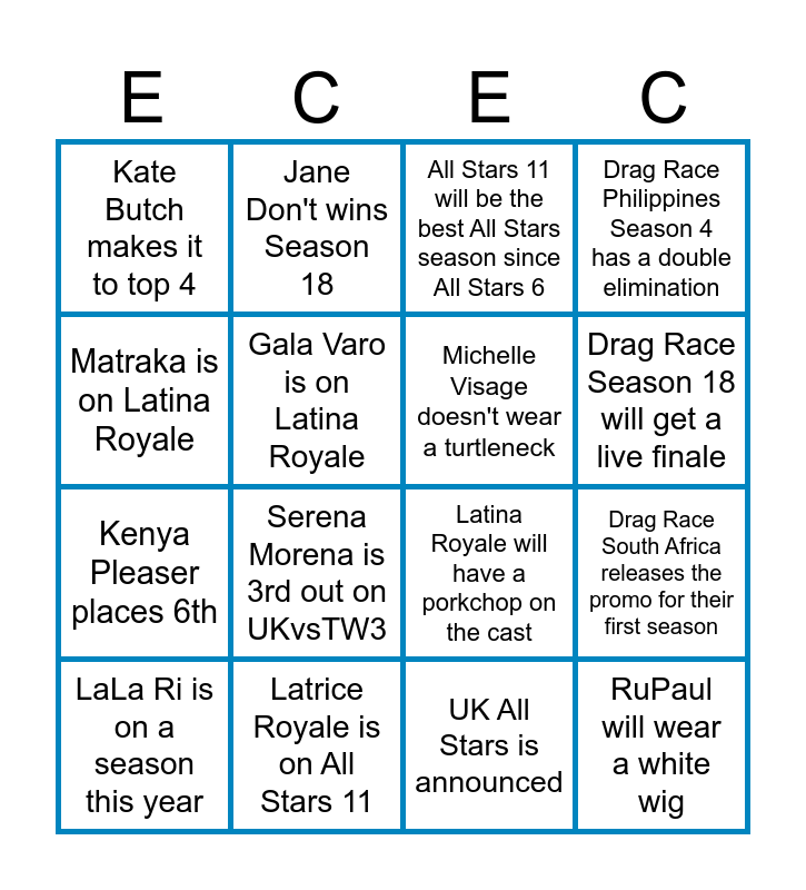 This bingo card has 16 words: LaLa Ri is on a season this year, Latrice Royale is on All Stars 11, All Stars 11 will be the best All Stars season since All Stars 6, Drag Race Philippines Season 4 has a double elimination, Matraka is on Latina Royale, Jane Don't wins Season 18, Latina Royale will have a porkchop on the cast, Drag Race South Africa releases the promo for their first season, Kate Butch makes it to top 4, Gala Varo is on Latina Royale, UK All Stars is announced, Drag Race Season 18 will get a live finale, Kenya Pleaser places 6th, Serena Morena is 3rd out on UKvsTW3, Michelle Visage doesn't wear a turtleneck and RuPaul will wear a white wig.
