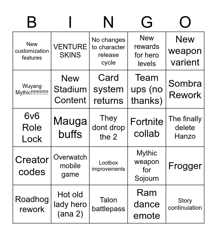 This bingo card has a free space and 24 words: Overwatch mobile game, Hot old lady hero (ana 2), Card system returns, Roadhog rework, New weapon varient, New customization features, Wuyang Mythic!!!!!!!!!!!!, VENTURE SKINS, Fortnite collab, Lootbox improvements, Team ups (no thanks), 6v6 Role Lock, Mythic weapon for Sojourn, Frogger, New Stadium Content, Ram dance emote, The finally delete Hanzo, No changes to character release cycle, Sombra Rework, Mauga buffs, Story continuiation, Creator codes, New rewards for hero levels and Talon battlepass.