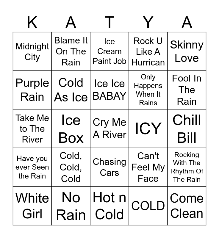 This bingo card has 27 words: Can't Feel My Face, Come Clean, Only Happens When It Rains, Hot n Cold, Purple Rain, Ice Cream Paint Job, Blame It On The Rain, Have you ever Seen the Rain, ICY, Rocking With The Rhythm Of The Rain, Take Me to The River, Rock U Like A Hurrican, White Girl, No Rain, Fool In The Rain, SNOW, Cold As Ice, Ice Ice BABAY, Cold, Cold, Cold, Midnight City, Chill Bill, COLD, Ice Box, Cry Me A River, Chasing Cars, Skinny Love and Riptide.