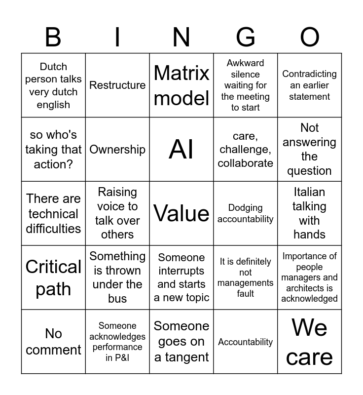 This bingo card has 34 words: We care, Accountability, I don't know, I did not make that decision, Critical path, Ownership, Contradicting an earlier statement, No comment, Restructure, Necessary risk, AI, Matrix model, Applause for a question, ADM, Dodging accountability, Not answering the question, Someone acknowledges performance in P&I, There are technical difficulties, Something is thrown under the bus, It is definitely not managements fault, Someone interrupts and starts a new topic, Reference to former employee, Dutch person talks very dutch english, Italian talking with hands, Someone goes on a tangent, Value, Awkward silence waiting for the meeting to start, Acknowledged, care, challenge, collaborate, so who's taking that action?, The person needed is not in the room, Raising voice to talk over others, Importance of people managers and architects is acknowledged and Someone acknowledges integration in P&I.