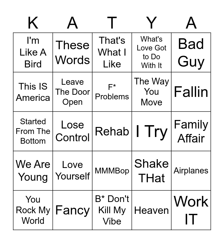 This bingo card has 37 words: Abracadra, End Of The World, Super Bass, Leave The Door Open, Airplanes, Love Yourself, F* Problems, All I Wanna Do, Bad Guy, Collard Greens, Lose Control, What's Love Got to Do With It, Rehab, Family Affair, This IS America, We Are Young, Paper Planes, That's What I Like, MMMBop, I Try, I'm Like A Bird, Fallin, You Rock My World, B* Don't Kill My Vibe, Foolish, Heaven, These Words, Good Life, Got Money, Work Out, Payphone, Fancy, Started From The Bottom, Work IT, Shake THat, The Way You Move and Irreplicable.