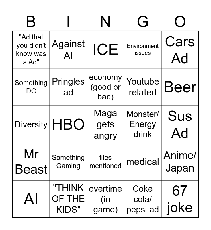 This bingo card has a free space and 34 words: Hersey ad, Coke cola/ pepsi ad, Amazon, Netflix, Mr Beast, Pringles ad, Cars Ad, AI, Against AI, gym, economy (good or bad), ICE, X (twitter), savage AD (right to the throat), Monster/ Energy drink, Beer, "THINK OF THE KIDS", Diversity, Something Gaming, medical, files mentioned, Melania Trump special, "Ad that you didn't know was a Ad", Sus Ad, overtime (in game), 67 joke, Environment issues, Left wing Ad, Youtube related, Something DC, Something Disney, HBO, Anime/ Japan and South PArk.