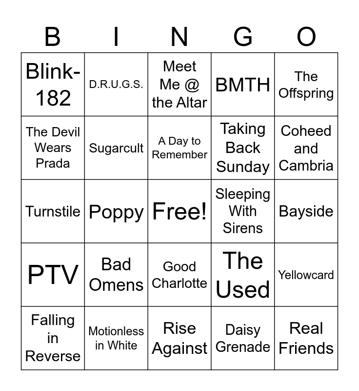 This bingo card has a free space and 24 words: Bad Omens, Motionless in White, A Day to Remember, Falling in Reverse, The Offspring, Blink-182, The Devil Wears Prada, D.R.U.G.S., Sleeping With Sirens, Good Charlotte, Taking Back Sunday, Turnstile, The Used, Yellowcard, Sugarcult, Daisy Grenade, Bayside, Meet Me @ the Altar, Coheed and Cambria, Poppy, Real Friends, PTV, BMTH and Rise Against.