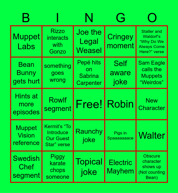 This bingo card has a free space and 24 words: Kermit’s “To Introduce Our Guest Star” verse, Piggy karate chops someone, Pepé hits on Sabrina Carpenter, Swedish Chef segment, Statler and Waldorf’s “Why Do We Always Come Here?” verse, Muppet Labs, Bean Bunny gets hurt, Rizzo interacts with Gonzo, Robin, Raunchy joke, Self aware joke, Hints at more episodes, Pigs in Spaaaaaaace, Walter, something goes wrong, Electric Mayhem, New Character, Joe the Legal Weasel, Sam Eagle calls the Muppets “Weirdos”, Rowlf segment, Obscure character shows up (Not counting Bean), Muppet Vision reference, Cringey moment and Topical joke.