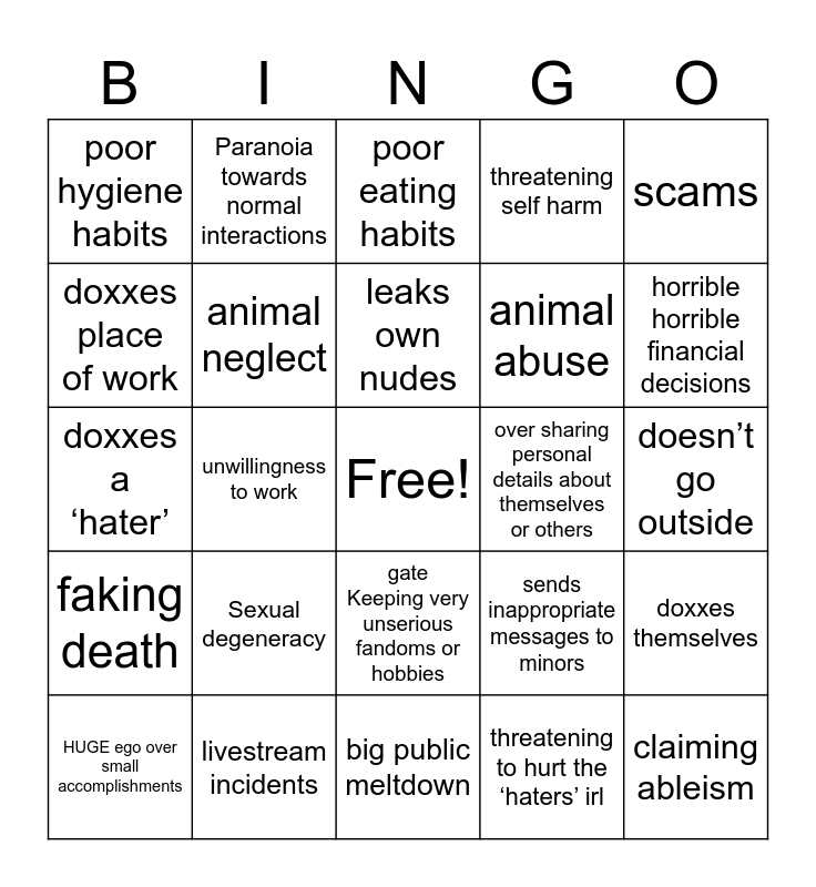This bingo card has a free space and 24 words: Sexual degeneracy, livestream incidents, leaks own nudes, HUGE ego over small accomplishments, scams, poor hygiene habits, doxxes place of work, Paranoia towards normal interactions, over sharing personal details about themselves or others, gate Keeping very unserious fandoms or hobbies, animal abuse, doxxes a ‘hater’, sends inappropriate messages to minors, doxxes themselves, animal neglect, threatening to hurt the ‘haters’ irl, doesn’t go outside, poor eating habits, horrible horrible financial decisions, unwillingness to work, claiming ableism, faking death, threatening self harm and big public meltdown.