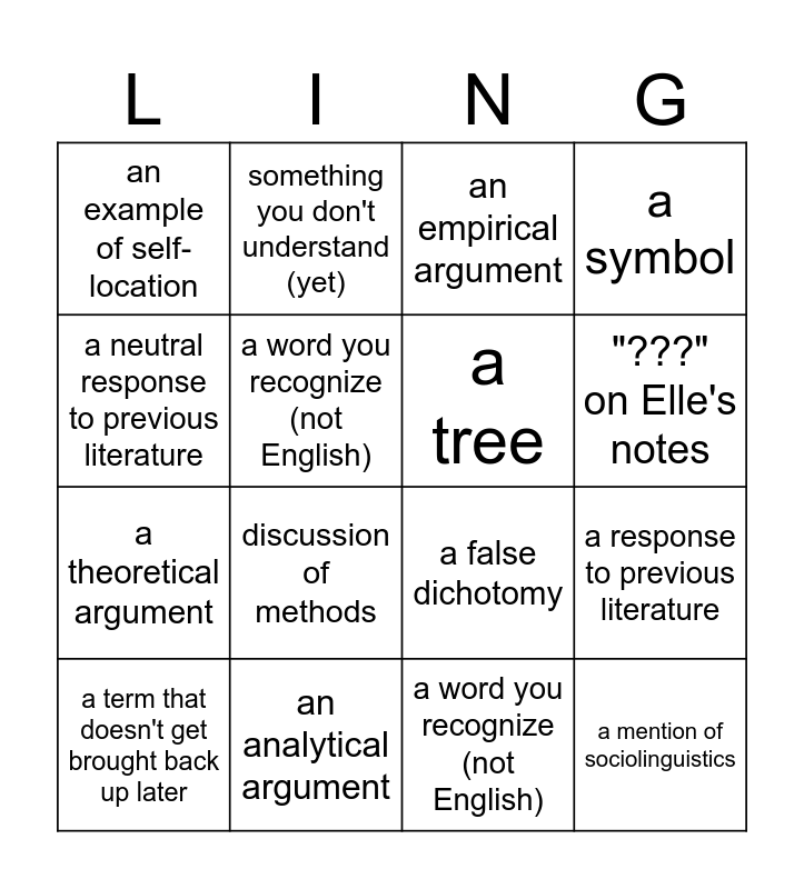 This bingo card has 16 words: an analytical argument, a response to previous literature, an empirical argument, an example of self-location, a theoretical argument, something you don't understand (yet), a false dichotomy, a word you recognize (not English), a neutral response to previous literature, a word you recognize (not English), a term that doesn't get brought back up later, a symbol, discussion of methods, "???" on Elle's notes, a tree and a mention of sociolinguistics.