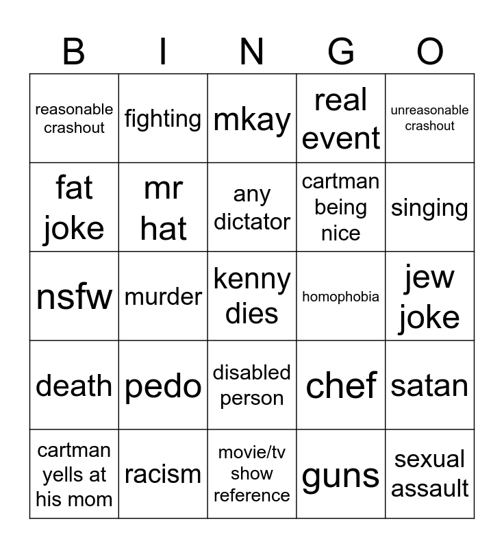 This bingo card has a free space and 24 words: pedo, racism, any dictator, cartman yells at his mom, unreasonable crashout, reasonable crashout, fat joke, fighting, homophobia, disabled person, cartman being nice, nsfw, chef, satan, mr hat, guns, jew joke, mkay, singing, murder, sexual assault, death, real event and movie/tv show reference.