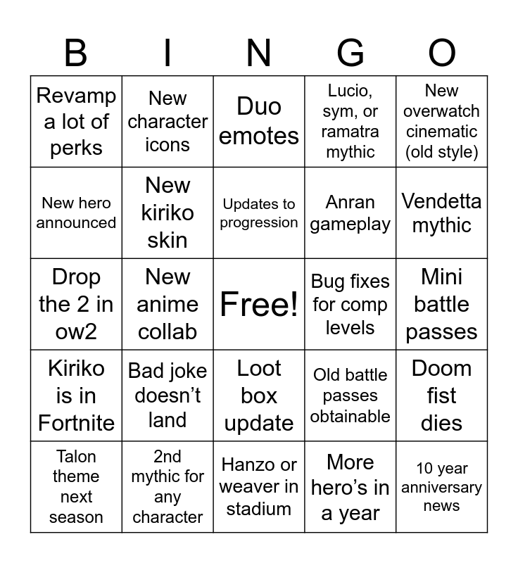 This bingo card has a free space and 24 words: Bad joke doesn’t land, 2nd mythic for any character, Updates to progression, Talon theme next season, New overwatch cinematic (old style), Revamp a lot of perks, New hero announced, New character icons, Bug fixes for comp levels, Loot box update, Anran gameplay, Drop the 2 in ow2, Old battle passes obtainable, Doom fist dies, New kiriko skin, More hero’s in a year, Mini battle passes, Duo emotes, Vendetta mythic, New anime collab, 10 year anniversary news, Kiriko is in Fortnite, Lucio, sym, or ramatra mythic and Hanzo or weaver in stadium.
