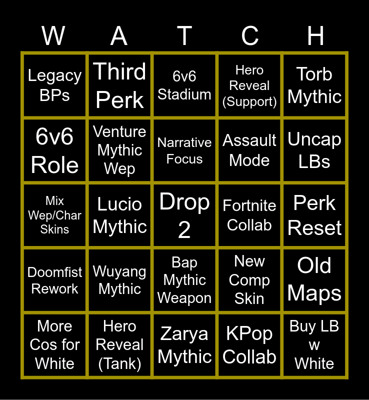 This bingo card has a free space and 24 words: Wuyang Mythic, Hero Reveal (Tank), Narrative Focus, More Cos for White, Torb Mythic, Legacy BPs, 6v6 Role, Third Perk, Fortnite Collab, Bap Mythic Weapon, Assault Mode, Mix Wep/Char Skins, New Comp Skin, Old Maps, Venture Mythic Wep, KPop Collab, Perk Reset, 6v6 Stadium, Uncap LBs, Lucio Mythic, Buy LB w White, Doomfist Rework, Hero Reveal (Support) and Zarya Mythic.