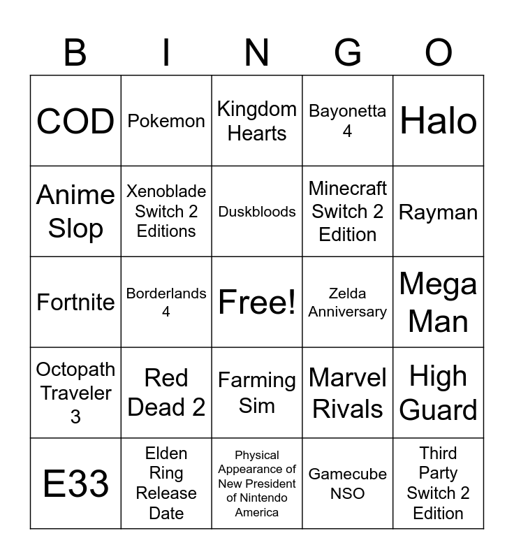 This bingo card has a free space and 24 words: Red Dead 2, Elden Ring Release Date, Duskbloods, E33, Halo, COD, Anime Slop, Pokemon, Zelda Anniversary, Farming Sim, Minecraft Switch 2 Edition, Fortnite, Marvel Rivals, High Guard, Xenoblade Switch 2 Editions, Gamecube NSO, Mega Man, Kingdom Hearts, Rayman, Borderlands 4, Third Party Switch 2 Edition, Octopath Traveler 3, Bayonetta 4 and Physical Appearance of New President of Nintendo America.