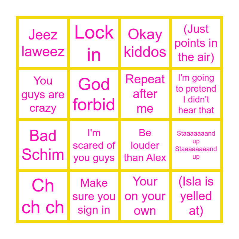 This bingo card has 16 words: Make sure you sign in, Staaaaaaand up Staaaaaaaand up, Okay kiddos, Jeez laweez, Bad Schim, Lock in, Be louder than Alex, Your on your own, You guys are crazy, God forbid, Ch ch ch, (Just points in the air), I'm scared of you guys, I'm going to pretend I didn't hear that, Repeat after me and (Isla is yelled at).