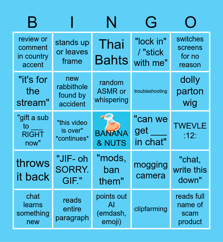 This bingo card has a free space and 31 words: points out AI (emdash, emoji), right click > inspect page, "this video is over" *continues*, new badge added to banner, review or comment in country accent, Thai Bahts, new rabbithole found by accident, mogging camera, "can we get ___ in chat", clipfarming, TWEVLE :12:, reads full name of scam product, Jamlab color palette feature, extreme shock or freaking out, dolly parton wig, starts singing, "chat, write this down", "JIF- oh SORRY. GIF.", throws it back, "mods, ban them", switches screens for no reason, gets distracted, chat learns something new, stands up or leaves frame, troubleshooting, "it's for the stream", "lock in" / "stick with me", "gift a sub to ___ RIGHT now", reads entire paragraph, random ASMR or whispering and opens paint.net.