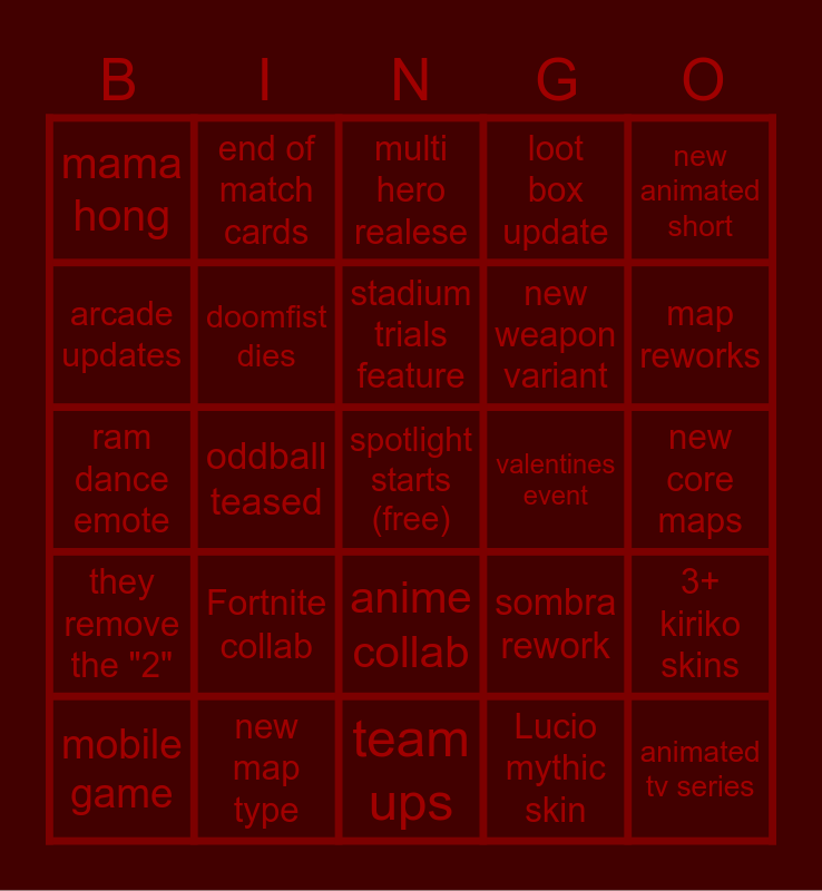 This bingo card has a free space and 24 words: mobile game, Fortnite collab, stadium trials feature, Lucio mythic skin, new animated short, mama hong, end of match cards, multi hero realese, valentines event, new core maps, ram dance emote, doomfist dies, sombra rework, 3+ kiriko skins, arcade updates, new map type, team ups, loot box update, map reworks, they remove the "2", oddball teased, anime collab, new weapon variant and animated tv series.
