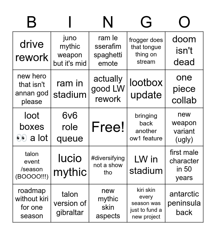 This bingo card has a free space and 24 words: roadmap without kiri for one season, lucio mythic, actually good LW rework, kiri skin every season was just to fund a new project, doom isn't dead, drive rework, juno mythic weapon but it's mid, ram le sserafim spaghetti emote, bringing back another ow1 feature, new weapon variant (ugly), loot boxes 👀 a lot, ram in stadium, LW in stadium, first male character in 50 years, new hero that isn't annan god please, talon version of gibraltar, new mythic skin aspects, frogger does that tongue thing on stream, one piece collab, talon event /season (BOOOO!!!), 6v6 role queue, #diversifying not a show tho, lootbox update and antarctic peninsula back.