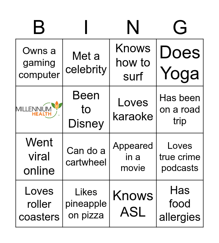This bingo card has 1 images and 15 words: Likes pineapple on pizza, Loves true crime podcasts, Knows how to surf, Owns a gaming computer, Went viral online, Met a celebrity, Appeared in a movie, Knows ASL, Been to Disney, Loves roller coasters, Does Yoga, Can do a cartwheel, Has been on a road trip, Loves karaoke and Has food allergies.
