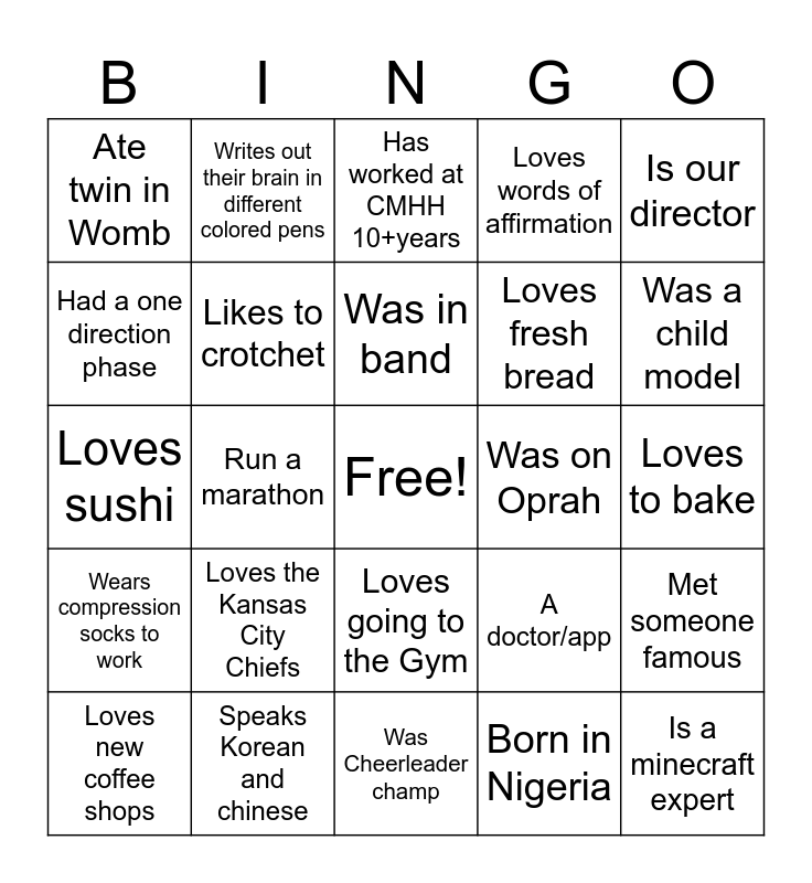 This bingo card has a free space and 107 words: Been to Japan, Double jointed, Run a marathon, Traveled outside the US every year for past 5 years, Owns a cat, Owns a dog, Different profession prior to nursing, Had a Justin Bieber phase, Went to TAMU, From the northern states!, Not from texas, Scared of birds, Married over 10 years, An only child, Can dance the salsa, Never makes it to huddle, Writes out their brain in different colored pens, Has gone on a trip in the last month, Keeps all the letters they get, Loves the Philly Eagles, Loves the Kansas City Chiefs, Has a hidden tattoo, Is a discharge champion, Is a CERN, Is a manager!, Is our director, Had a one direction phase, Loves words of affirmation, Worked a different nursing specialty prior to heart center, Got married/engaged in the last year, Has been to every continent, Speaks Korean and chinese, Is involved in lengthy legal battle, Allergic to shrimp, Swam with sharks, Has worked at CMHH 10+years, Played a competitive sport growing up, 5+ siblings, Has triple citizenship, Is a minecraft expert, Played lacrosse, Loves to go to national parks, Was Cheerleader champ, Was in a sorority, Has a degree in something other than nursing, Likes to crotchet, Likes to needle point, Was in band, Youngest grandchild out of 24, Was on Oprah, Has a service dog, Was a child model, Wears compression socks to work, In NP school, A pescatarian/Vegitatian, Went to LSU, Owns a pug, Speaks multiple languages, Can jump Really high, Ate twin in Womb, Collects something unique, Loves wicked, Loves to read, Brews their own Coffee, Grew up in Michigan, Has been a nurse for 25+ years, 1st place in spelling bee, Met someone famous, Loves strawberries so much they can eat their weight in it, A doctor/app, Loves going to the Gym, Loves sushi, Born in Nigeria, Just passed their Nclex, Loves to go to Disney world, Locked inside mall after closing, Went to HBU, Has only ever worked nightshift, Won nursing leader of the year!, Was a former backpack leash kid, Got kicked out of Universal Park by Kanye West & Kim K, Owns Horses, Is a first year nurse, Is a boy mom!, Is a girl mom!, Is a boy dad!, Is a girl dad!, Police officer + RN, Did parasailing in Hawaii, Has a twin, Loves fresh bread, Has slept through a work shift, Went on a destination wedding, Went on a medical mission trip, Loves to kill ppl w kindness, Multiple kids under 3 years old, Loves new coffee shops, Their birthday is on a holiday, Got married to their high school sweetheart, Loves to use their planner, BSN graduate at age 20, Nursing is their 2nd/3rd career, Born in another country, Plays an instrument, Has been to a music festival, Loves to bake and Goes roller skating.