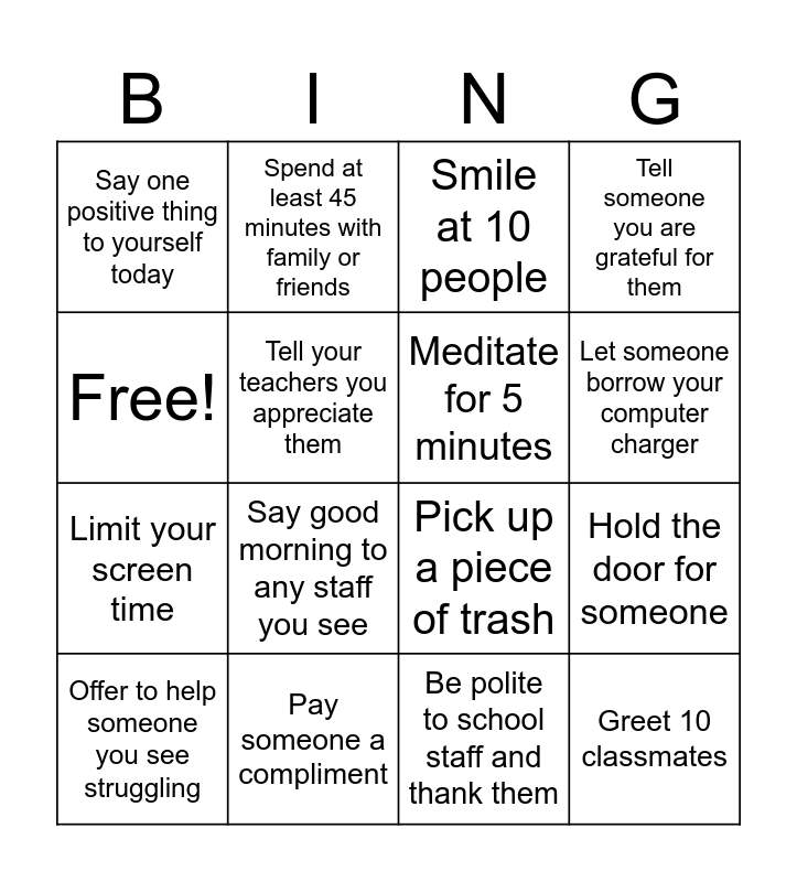 This bingo card has 16 words: Pay someone a compliment, Hold the door for someone, Smile at 10 people, Say one positive thing to yourself today, Limit your screen time, Spend at least 45 minutes with family or friends, Pick up a piece of trash, Be polite to school staff and thank them, Free!, Tell your teachers you appreciate them, Offer to help someone you see struggling, Tell someone you are grateful for them, Say good morning to any staff you see, Let someone borrow your computer charger, Meditate for 5 minutes and Greet 10 classmates.