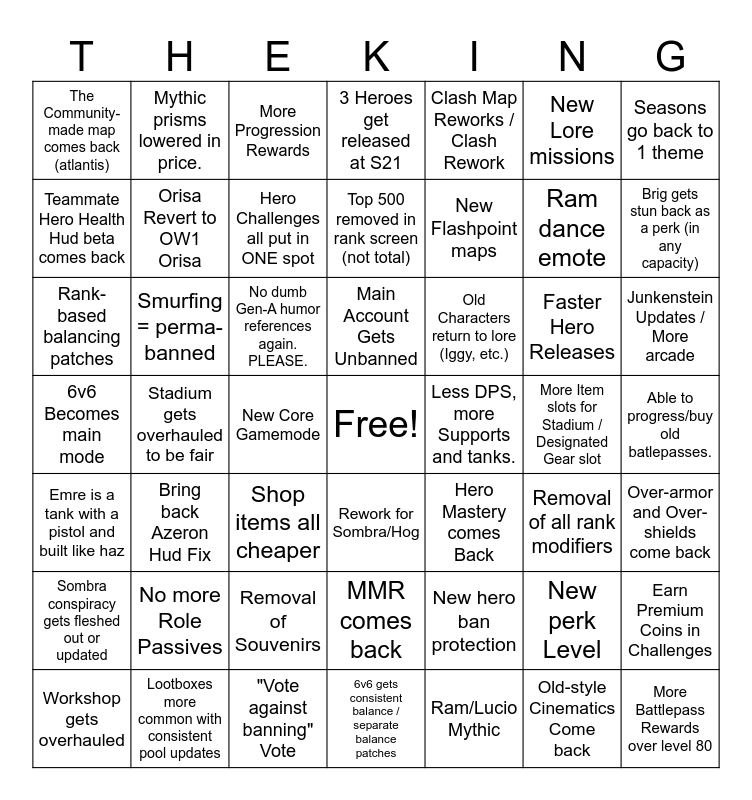 This bingo card has a free space and 48 words: New hero ban protection, Ram dance emote, 6v6 gets consistent balance / separate balance patches, Stadium gets overhauled to be fair, No dumb Gen-A humor references again. PLEASE., Able to progress/buy old batlepasses., Mythic prisms lowered in price., Lootboxes more common with consistent pool updates, New Lore missions, Rework for Sombra/Hog, Seasons go back to 1 theme, 3 Heroes get released at S21, Faster Hero Releases, Old Characters return to lore (Iggy, etc.), Sombra conspiracy gets fleshed out or updated, More Item slots for Stadium / Designated Gear slot, Teammate Hero Health Hud beta comes back, Brig gets stun back as a perk (in any capacity), New perk Level, Clash Map Reworks / Clash Rework, New Flashpoint maps, New Core Gamemode, The Community-made map comes back (atlantis), Orisa Revert to OW1 Orisa, Earn Premium Coins in Challenges, Hero Challenges all put in ONE spot, Junkenstein Updates / More arcade, Workshop gets overhauled, Main Account Gets Unbanned, Smurfing = perma- banned, Old-style Cinematics Come back, Less DPS, more Supports and tanks., Over-armor and Over-shields come back, No more Role Passives, 6v6 Becomes main mode, Hero Mastery comes Back, Removal of all rank modifiers, Rank-based balancing patches, Shop items all cheaper, Removal of Souvenirs, Emre is a tank with a pistol and built like haz, More Battlepass Rewards over level 80, More Progression Rewards, "Vote against banning" Vote, Top 500 removed in rank screen (not total), MMR comes back, Bring back Azeron Hud Fix and Ram/Lucio Mythic.