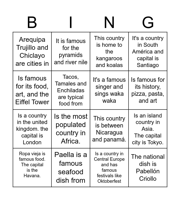 This bingo card has 16 words: Paella is a famous seafood dish from, Is an island country in Asia. The capital city is Tokyo., This country is home to the kangaroos and koalas, Arequipa Trujillo and Chiclayo are cities in, Is a country in the united kingdom. the capital is London, It is famous for the pyramids and river nile, This country is between Nicaragua and panamá., Is a country in Central Europe and has famous festivals like Oktoberfest, Is famous for its food, art, and the Eiffel Tower, Tacos, Tamales and Enchiladas are typical food from, Ropa vieja is famous food. The capital is the Havana., It's a country in South América and capital is Santiago, Is the most populated country in Africa., Is famous for its history, pizza, pasta, and art, It's a famous singer and sings waka waka and The national dish is Pabellón Criollo.