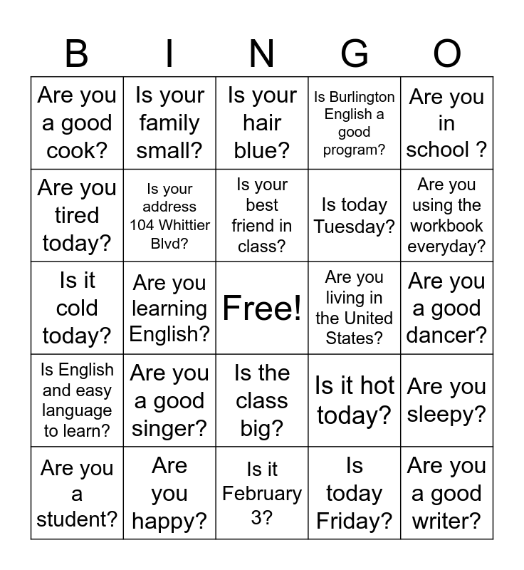 This bingo card has a free space and 24 words: Are you a student?, Are you a good singer?, Is your best friend in class?, Is today Friday?, Are you in school ?, Are you a good cook?, Is your family small?, Is your hair blue?, Are you living in the United States?, Are you a good dancer?, Is it cold today?, Is your address 104 Whittier Blvd?, Is it hot today?, Are you sleepy?, Are you tired today?, Are you happy?, Is it February 3?, Is Burlington English a good program?, Are you using the workbook everyday?, Is English and easy language to learn?, Are you learning English?, Is the class big?, Is today Tuesday? and Are you a good writer?.