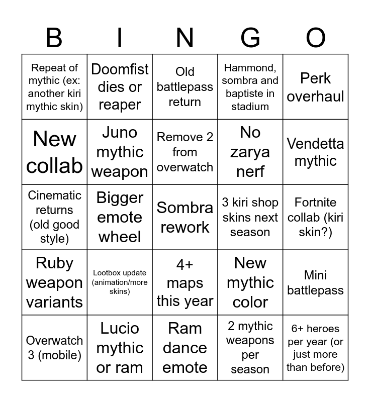 This bingo card has a free space and 24 words: Lootbox update (animation/more skins), Lucio mythic or ram, Remove 2 from overwatch, Overwatch 3 (mobile), Perk overhaul, Repeat of mythic (ex: another kiri mythic skin), New collab, Doomfist dies or reaper, 3 kiri shop skins next season, 4+ maps this year, No zarya nerf, Cinematic returns (old good style), New mythic color, Mini battlepass, Juno mythic weapon, 2 mythic weapons per season, Fortnite collab (kiri skin?), Old battlepass return, Vendetta mythic, Bigger emote wheel, 6+ heroes per year (or just more than before), Ruby weapon variants, Hammond, sombra and baptiste in stadium and Ram dance emote.
