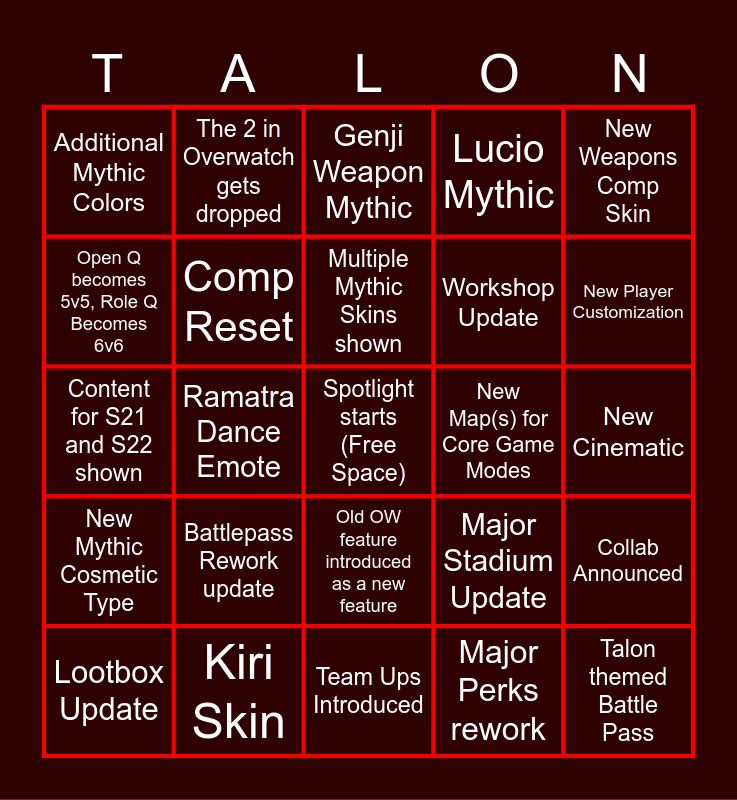 This bingo card has a free space and 24 words: Lootbox Update, Battlepass Rework update, Multiple Mythic Skins shown, Major Perks rework, New Weapons Comp Skin, Additional Mythic Colors, The 2 in Overwatch gets dropped, Genji Weapon Mythic, New Map(s) for Core Game Modes, New Cinematic, Content for S21 and S22 shown, Comp Reset, Major Stadium Update, Collab Announced, Open Q becomes 5v5, Role Q Becomes 6v6, Kiri Skin, Team Ups Introduced, Lucio Mythic, New Player Customization, New Mythic Cosmetic Type, Ramatra Dance Emote, Old OW feature introduced as a new feature, Workshop Update and Talon themed Battle Pass.