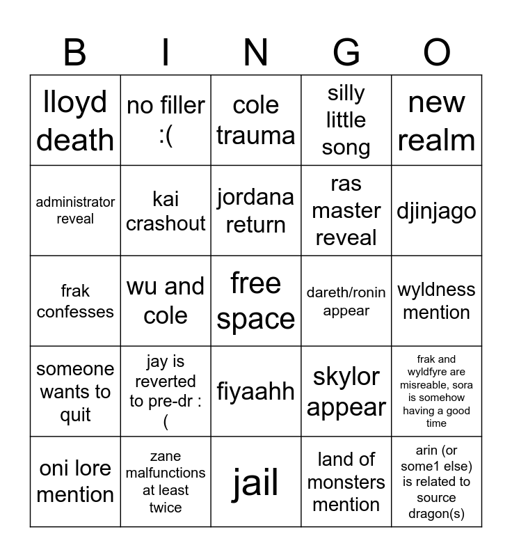 This bingo card has a free space and 24 words: jay is reverted to pre-dr :(, zane malfunctions at least twice, jordana return, oni lore mention, new realm, lloyd death, administrator reveal, no filler :(, dareth/ronin appear, fiyaahh, ras master reveal, frak confesses, skylor appear, frak and wyldfyre are misreable, sora is somehow having a good time, kai crashout, land of monsters mention, wyldness mention, cole trauma, djinjago, wu and cole, arin (or some1 else) is related to source dragon(s), someone wants to quit, silly little song and jail.