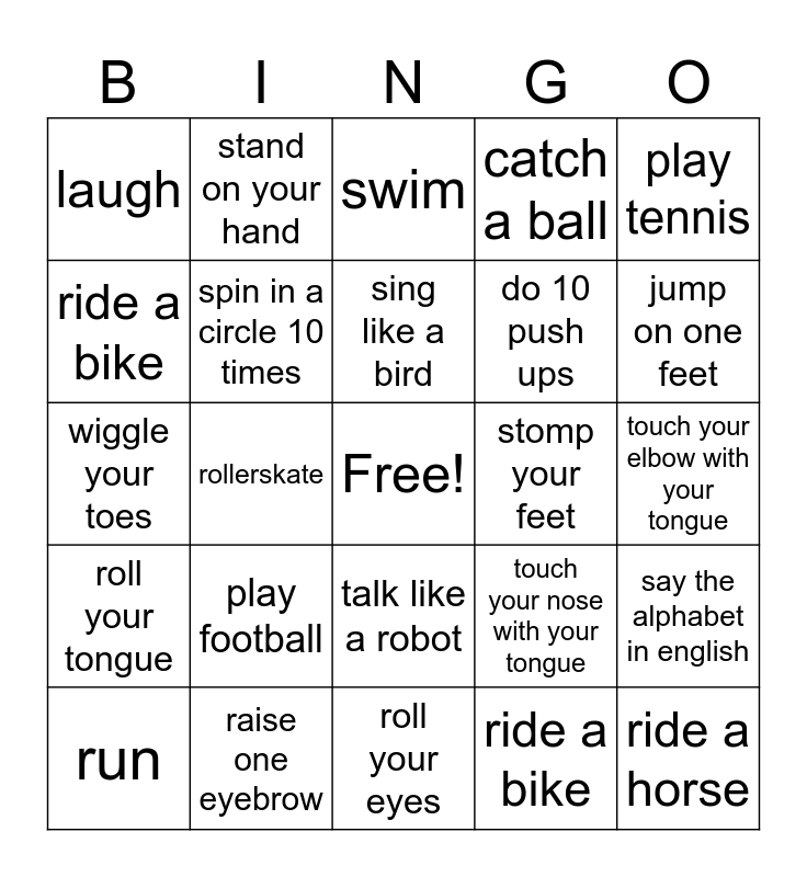 This bingo card has a free space and 24 words: play football, raise one eyebrow, sing like a bird, run, play tennis, laugh, ride a bike, stand on your hand, stomp your feet, talk like a robot, do 10 push ups, wiggle your toes, touch your nose with your tongue, say the alphabet in english, spin in a circle 10 times, ride a bike, touch your elbow with your tongue, swim, jump on one feet, rollerskate, ride a horse, roll your tongue, catch a ball and roll your eyes.