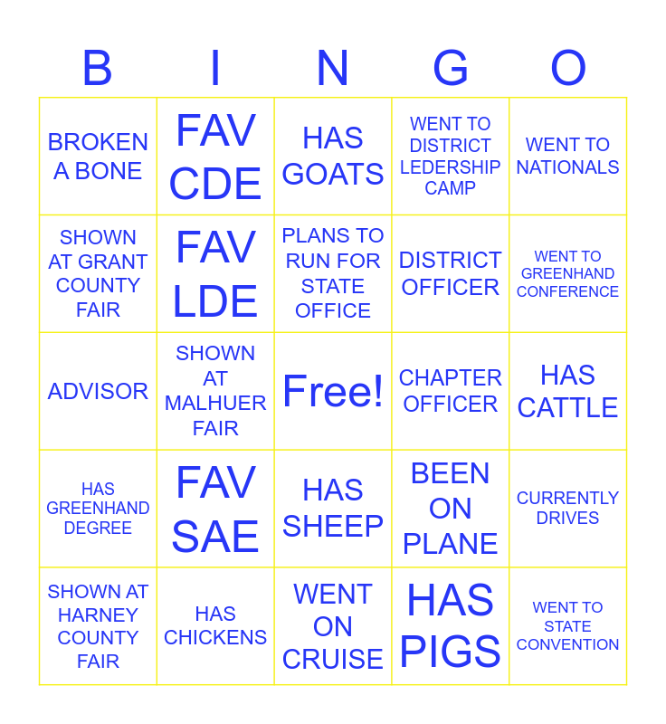 This bingo card has a free space and 24 words: FAV SAE, HAS CHICKENS, PLANS TO RUN FOR STATE OFFICE, SHOWN AT HARNEY COUNTY FAIR, WENT TO NATIONALS, BROKEN A BONE, SHOWN AT GRANT COUNTY FAIR, FAV CDE, CHAPTER OFFICER, HAS SHEEP, DISTRICT OFFICER, ADVISOR, BEEN ON PLANE, CURRENTLY DRIVES, FAV LDE, HAS PIGS, HAS CATTLE, HAS GOATS, WENT TO GREENHAND CONFERENCE, SHOWN AT MALHUER FAIR, WENT TO STATE CONVENTION, HAS GREENHAND DEGREE, WENT TO DISTRICT LEDERSHIP CAMP and WENT ON CRUISE.