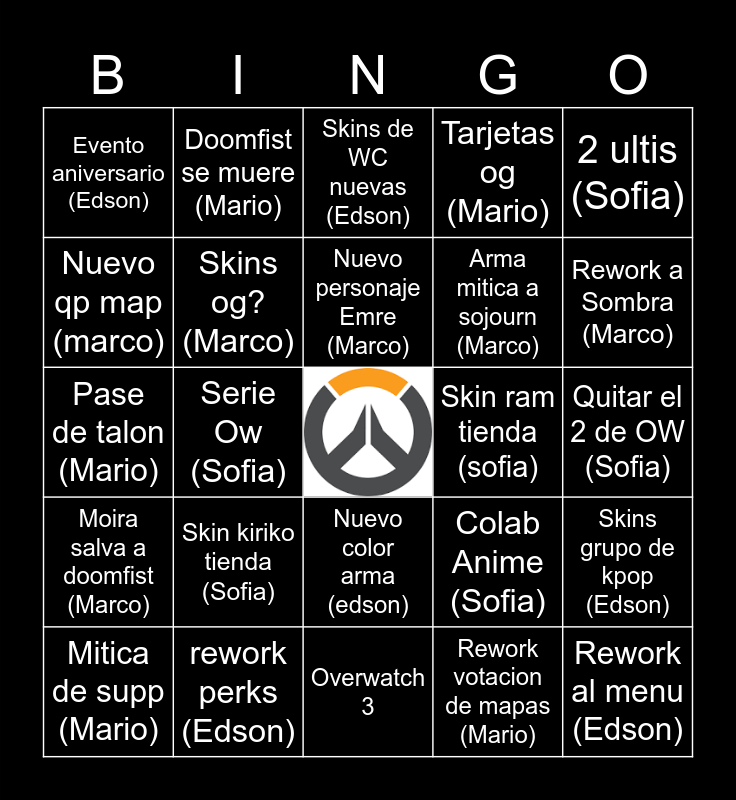 This bingo card has a free space and 24 words: Skin kiriko tienda (Sofia), rework perks (Edson), Nuevo personaje Emre (Marco), Mitica de supp (Mario), 2 ultis (Sofia), Evento aniversario (Edson), Nuevo qp map (marco), Doomfist se muere (Mario), Skin ram tienda (sofia), Nuevo color arma (edson), Arma mitica a sojourn (Marco), Pase de talon (Mario), Colab Anime (Sofia), Skins grupo de kpop (Edson), Skins og? (Marco), Rework votacion de mapas (Mario), Quitar el 2 de OW (Sofia), Skins de WC nuevas (Edson), Rework a Sombra (Marco), Serie Ow (Sofia), Rework al menu (Edson), Moira salva a doomfist (Marco), Tarjetas og (Mario) and Overwatch 3.