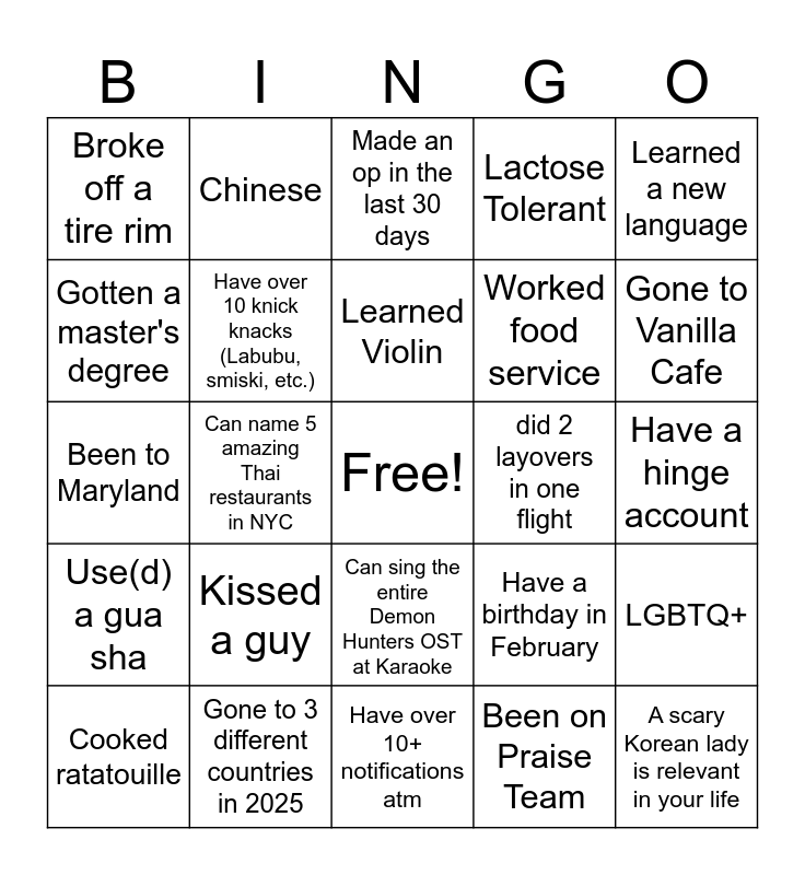 This bingo card has a free space and 24 words: Kissed a guy, Gone to 3 different countries in 2025, Learned Violin, Cooked ratatouille, Learned a new language, Broke off a tire rim, Gotten a master's degree, Chinese, did 2 layovers in one flight, Can sing the entire Demon Hunters OST at Karaoke, Worked food service, Been to Maryland, Have a birthday in February, LGBTQ+, Have over 10 knick knacks (Labubu, smiski, etc.), Been on Praise Team, Have a hinge account, Made an op in the last 30 days, Gone to Vanilla Cafe, Can name 5 amazing Thai restaurants in NYC, A scary Korean lady is relevant in your life, Use(d) a gua sha, Lactose Tolerant and Have over 10+ notifications atm.